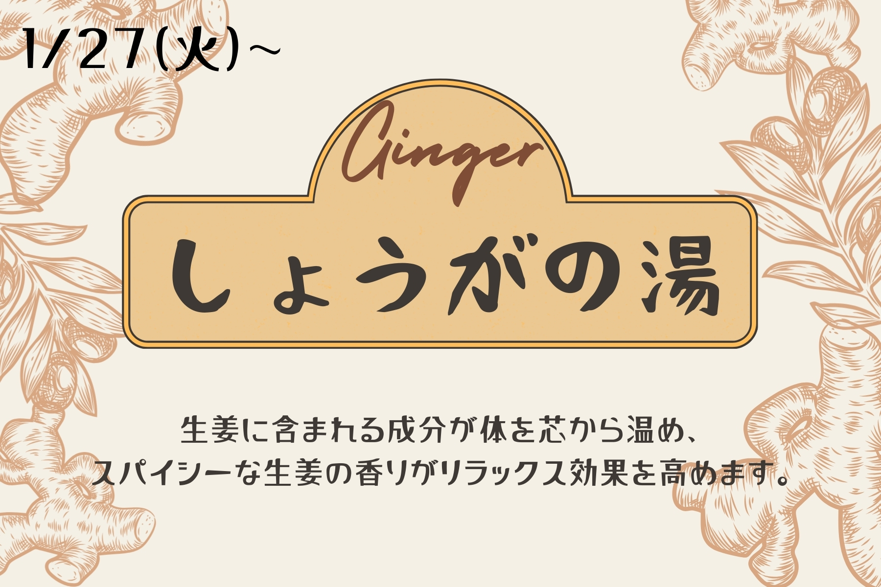 2026/01/23 『しょうがの湯』1/27(火)~ 1/27(火)より、湯楽城つぼ湯にて「しょうがの湯」が始まります! 体が温まるとされ、生薬としても使用されてきた生姜。 生姜に含まれる成分が体を芯から温め、冷えやコリを和らげます。 また、スパイシーな生姜の香りがリラックス効果を高めます。 ぜひ皆様のご感想をお聞かせください。 皆様のご来館を心よりお待ちしております(*^-^*)