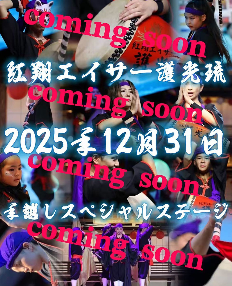 2025/11/28 紅翔エイサー護光琉 開催日: 2025年12月31日カテゴリー: イベント 紅翔エイサー護光琉:沖縄の伝統芸能、創作エイサー団体による歌と踊りとエイサーで、皆様に夏の琉球の風をお届けします。